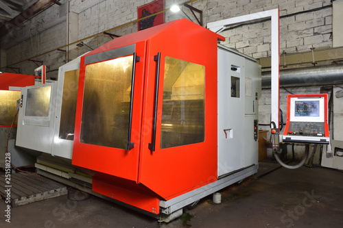 CNC machine for working with metal, slightly dirty, is in the factory. Cnc machine red