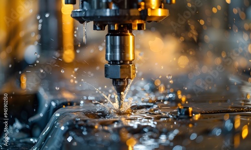 CNC machining centre drilling steel and using metal working fluid as coolant.