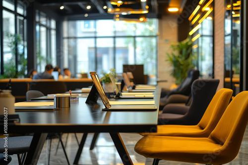 Co working space room with empty table and seat, Interior design of cozy office for office worker, Public working space for meeting.