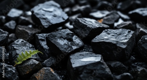 Coal chunks, rocky texture, black stones, industrial raw material, green leaf contrast, dark background, close-up photography, rough surfaces, mineral deposits, energy resource, environmental impact,