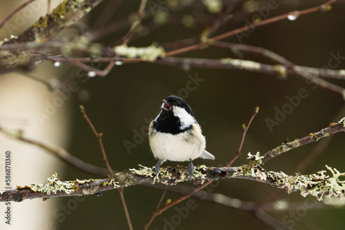Coal tit (Periparus ater) singing in the forest in early spring.
