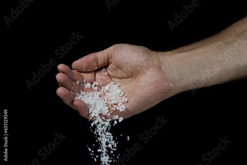 Coarse rock salt pours from a male hand on a black background