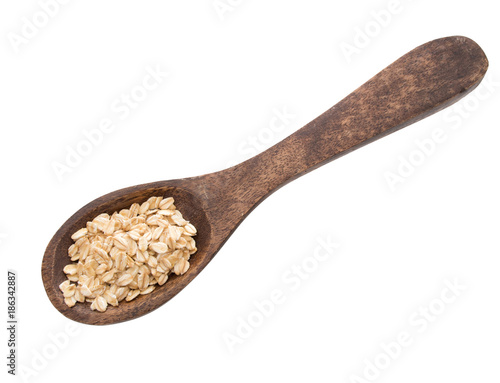 Coarsely rolled organic wholegrain oats on rustic wooden spoon, isolated on white.