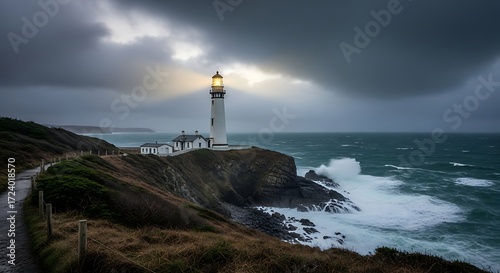 Coastal beacon shining amidst a tempestuous seascape under moody skies