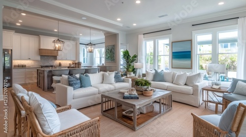 Coastal Chic Living Room Interior Design with Open Kitchen View