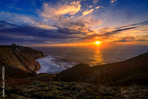 Coastal cliffs and silky ocean by Devil's Slide trail in California at sunset