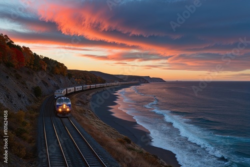 Coastal Cliffs Vibrant Autumn Sunset and Busy Railroad Journey