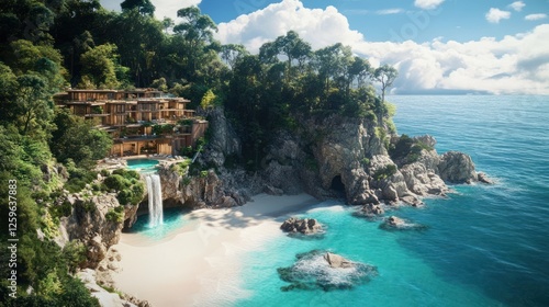 Coastal cliffside villas, waterfall, beach, ocean; luxury resort advertising