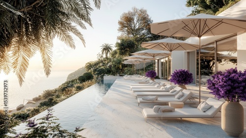 Coastal infinity pool deck with sun umbrellas and lounge chairs.