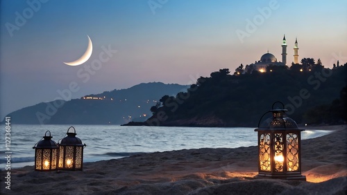 Coastal Ramadan Evening with Crescent Moon and Starry Sky