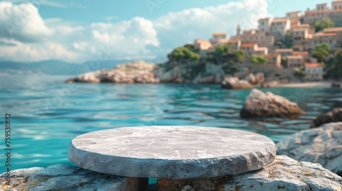 Coastal Stone Podium Mockup, Front View Product Display Overlooking Mediterranean Seascape