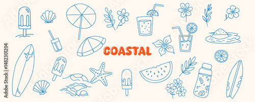 Coastal summer doodle vector illustration set featuring hand drawn seashells, sailboats, lighthouses, waves, birds, and ocean-themed sketch elements