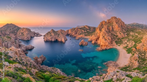 Coastal Sunset Panorama Rocky Bay and Azure Waters