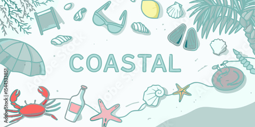 Coastal Themed Illustration with Beach Objects Crab Starfish Palm Tree and the Word Coastal in the Center
