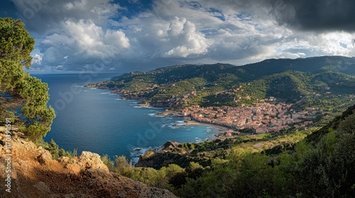 Coastal Town Panorama: A Breathtaking View of a Mediterranean Village Nestled Amongst Lush Hills and the Azure Sea Under a Dramatic Sky