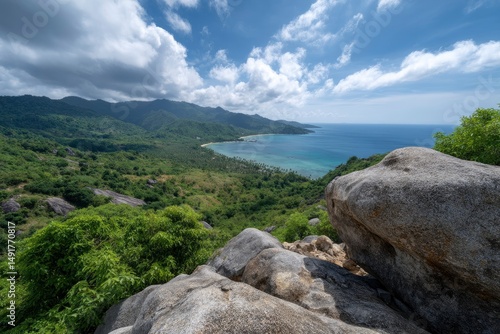 Coastal View From Rock Formation Overlooking Tropical Island Landscape
