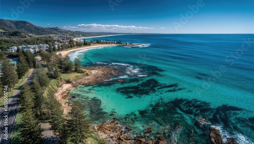 Coastal vista showcasing a turquoise bay, rocky shoreline, and distant town nestled beneath a clear sky