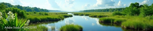Coastal wetland with dense vegetation and saltwater, vegetation, environment