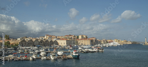 Coastline of old town Chania with port, lighthouse and fortress venetian Firka in Crete, Greece