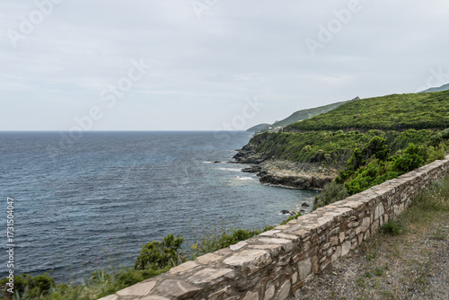 Coastline view Roadtrip Winding road along rocky coast of Cap Corse peninsula on Corsica island France