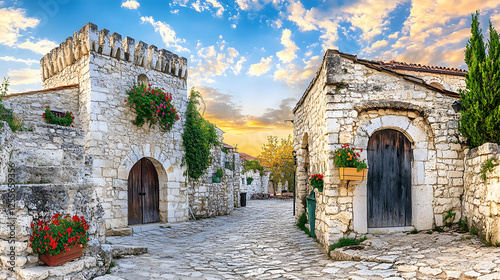 Cobbled street with stone building and colorful flowers in a picturesque local tourism area