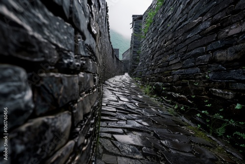 Cobblestone alleyway, wet and reflective, winds through ancient stone buildings, evoking mystery and history.