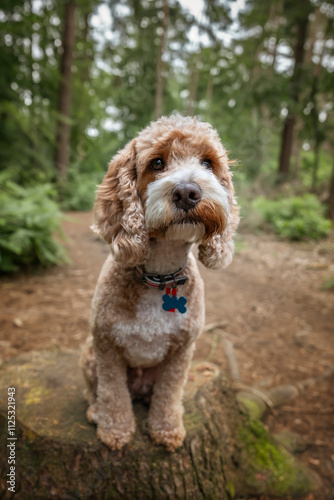 Cockapoo dog at Virginia Water Lake in Berkshire on a tree stump looking very cute