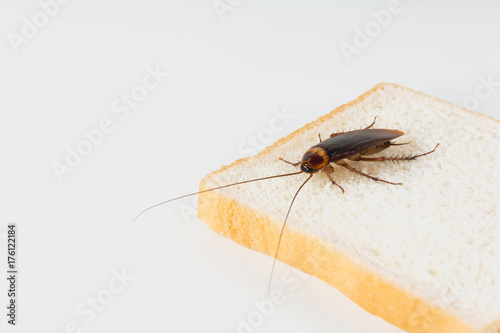 Cockroach on bread isolated on white background. Contagion the disease, Plague concept.