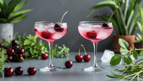Cocktail glasses with cherry beverages garnished with fresh cherries surrounded by leafy greens and a gray background Copy Space