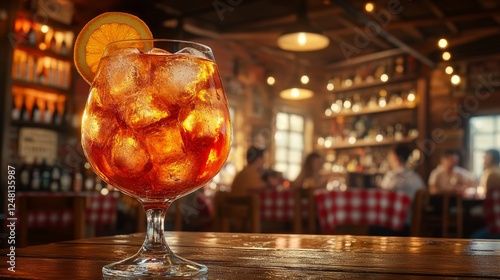 Cocktails are served in glass cups, with large ice cubes and orange slices placed on wooden tables in Italian restaurants, creating warm lighting, vintage decor, and a lively dining atmosphere