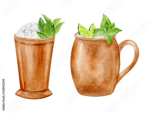 Cocktails in copper mug watercolor illustration. Drinks clipart isoltaed on white background.