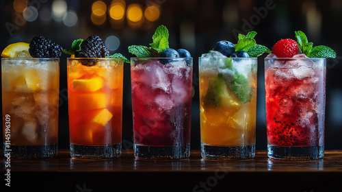 Cocktails with exotic fruits, ice, and colorful garnishes.