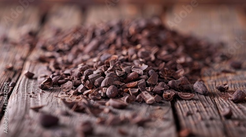 Cocoa nibs with a rich aroma displayed on a wooden surface
