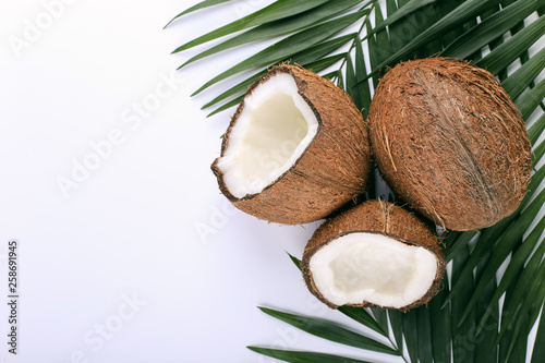 Coconut and palm leaves, copy space. Summer mood, tropical background, blank.