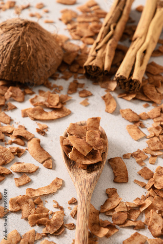 Coconut chips with cinnamon in wooden spoon, home drying. Vegan and sugar free dessert. Vertical format. Sri lankan local snack. Tasty snack add to garnish your dessert.