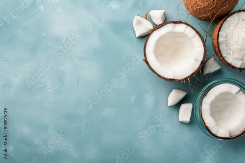 Coconut Halves and Palm Leaf on Blue Background