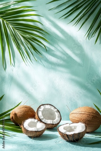 Coconut Halves and Whole Coconut with Palm Fronds on a Blue Background