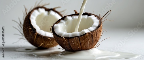 Coconut milk, positioned on a white surface, showcasing full depth of field