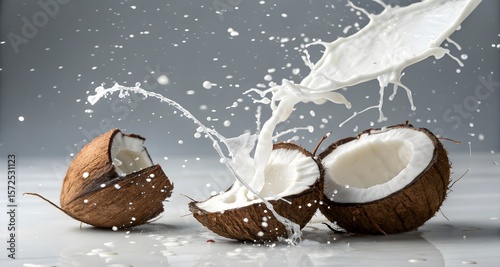 Coconut milk splashing from cracked coconuts, creating a dynamic, refreshing scene.