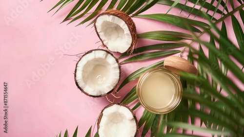 Coconut oil jar and fresh coconuts on pink background with palm leaves top view