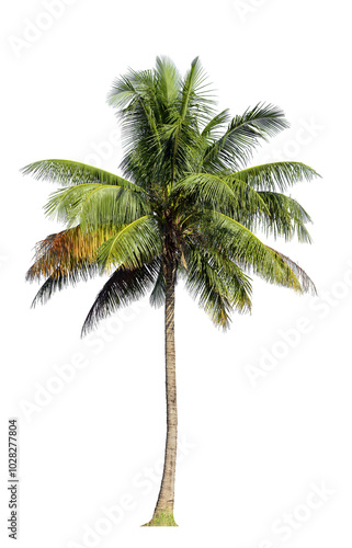 Coconut palm tree with a slender, textured trunk and a large crown of feathery green fronds. The palm leaves spread out gracefully, creating a tropical and refreshing vibe.