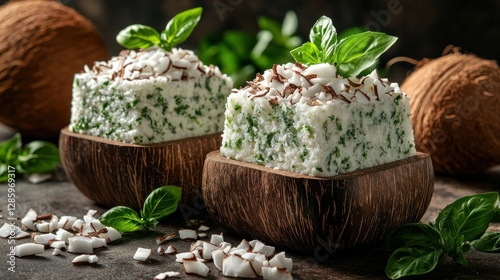 Coconut squares, garnished with basil, in wooden bowls, on dark rustic surface, with coconuts in background