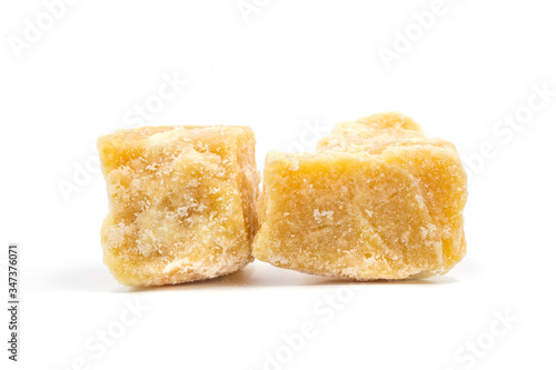 Coconut sugar cubes on white background.