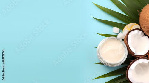 Coconut with jars of coconut oil and cosmetic cream on colored background. Top view. Free space for your text. Natural spa coconut cosmetics and organic treatment concept Coconut Spa composition
