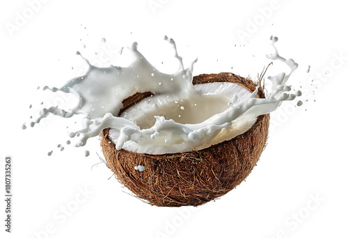 coconut with milk splash isolated on a white background, detailed illustration, high-resolution photography, professional photograph, all in focus, hyper-realistic, hyper-detailed, high color grading,