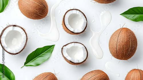 Coconuts and leaves arranged with milk splashes on a white backdrop, food photography