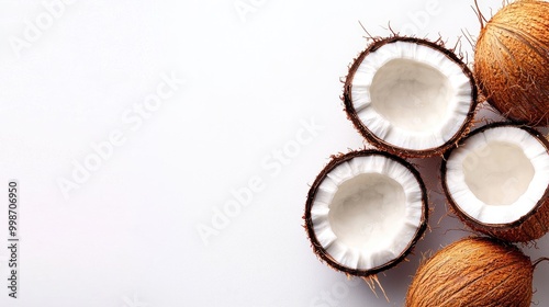 Coconuts cut in half, displaying fresh white flesh, on a white isolated background.