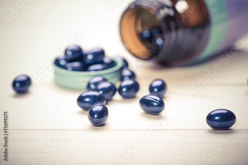 Cod liver oil omega 3 gel capsules isolated on wooden background