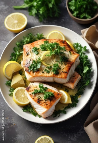 Cod with a zesty lemon-herb marinade served with a side of olive oil and fresh parsley, parsley, citrusy flavors