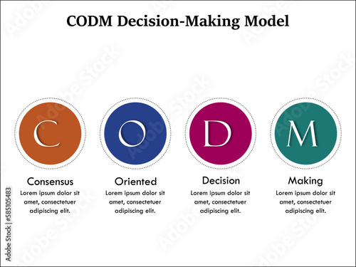 CODM - Consensus Oriented Decision making model Acronym. Infographic template with icons